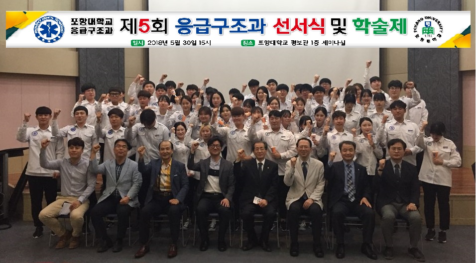 포항대학교(총장 정창조) 응급구조과는 지난 5월 30일 평보관 1층 세미나실에서 ‘제 5회 응급구조사 선서식 및 학술제’를 개최하였다. 이날 1부 행사인 선서식에 참석한 2, 3학년 56명은 선한 사마리아인으로서 기본 윤리를 갖추고 생명존중, 인간존중 정신을 바탕으로 의학적 지식과 술기를 질병과 손상으로 고통 받는 모든 응급환자에게 차별 없이 최선의 응급처치를 시행할 것을 다짐하였다.