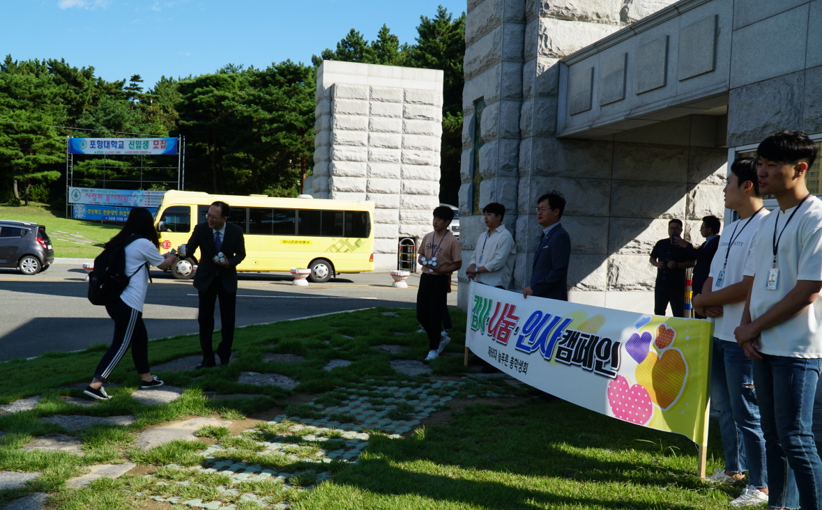 포항대학교(총장 한홍수) 총학생회와 학생입학처는 9월 신학기 개강과 동시에 아침 등교하는 재학생들을 응원하며 ‘감사․나눔․인사 캠페인’을 진행했다.