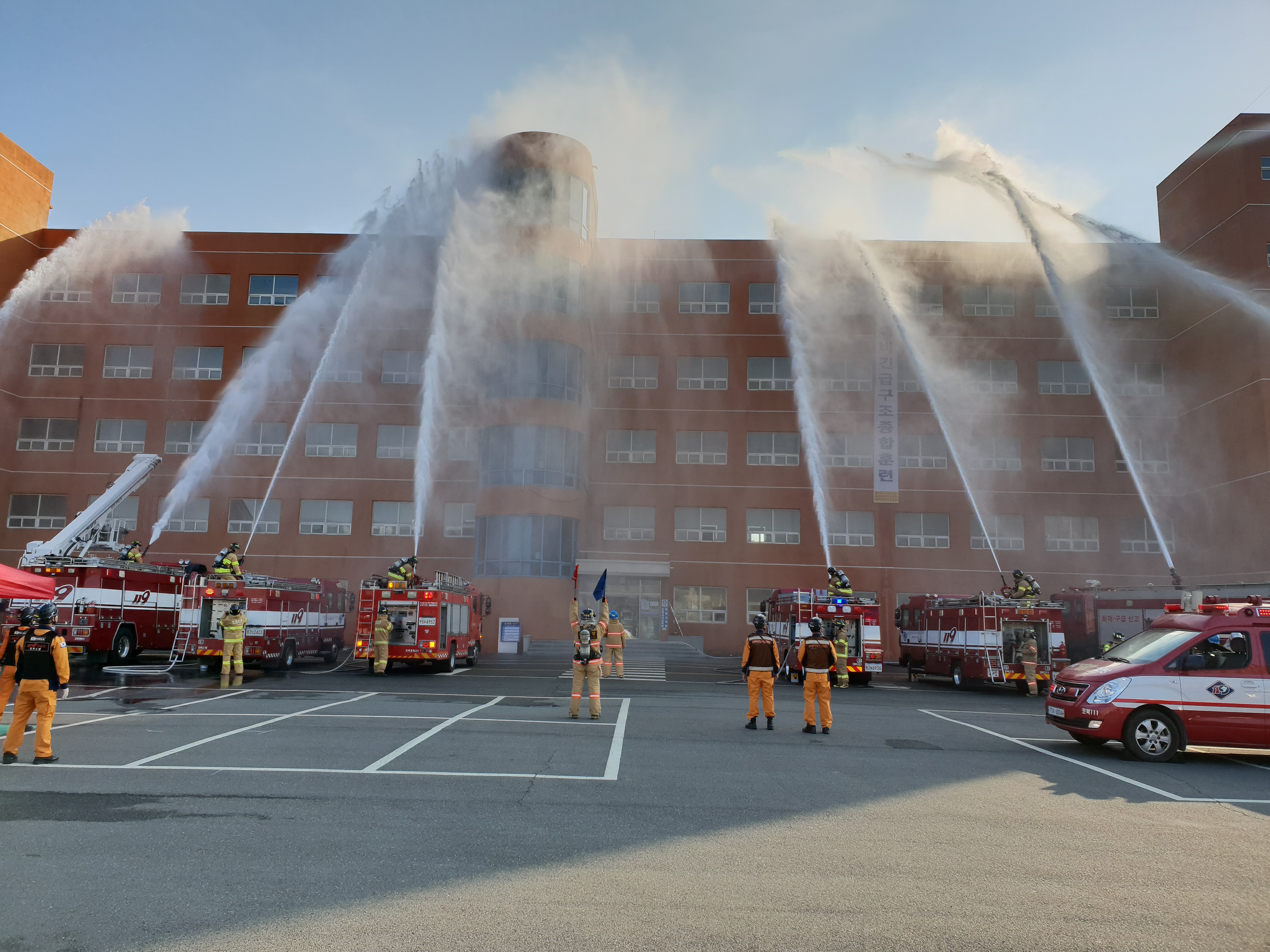 지난 6일 포항대학교에서 실시한 2018긴급구조종합훈련에서 포항북부소방서와 해군 6전단, 포스코포항제철소, 소방대,