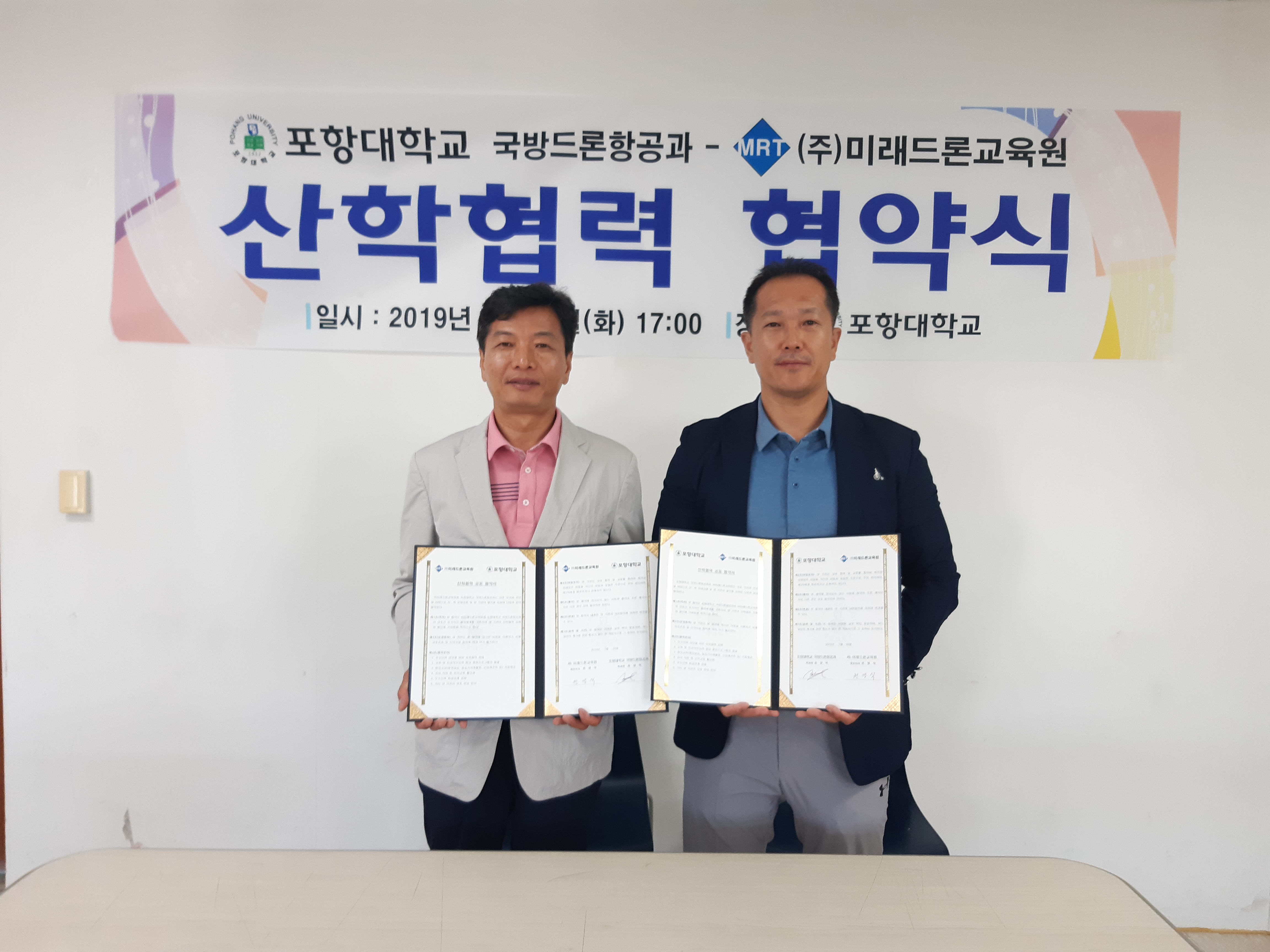 포항대학교(총장 한홍수) 국방드론항공과는 지난 7월 30일 포항대학교에서 송상욱 학과장과 ㈜미래드론교육원 권영식 대표이사 등 양 기관 관계자들이 참석한 가운데 산학협력 활성화 및 업무협력을 강화하기 위해 산학협력 협약 체결식을 가졌다.