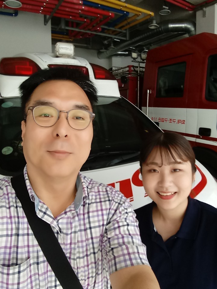 뜨거운 여름 안전장비를 착용하고 구급출동을 나가는 건 정말 힘든 일 이지만 현장에 직접 출동하여 현장처치법과 이송법을 배우는 건 정말 좋은 경험으로 남겨질 것입니다.