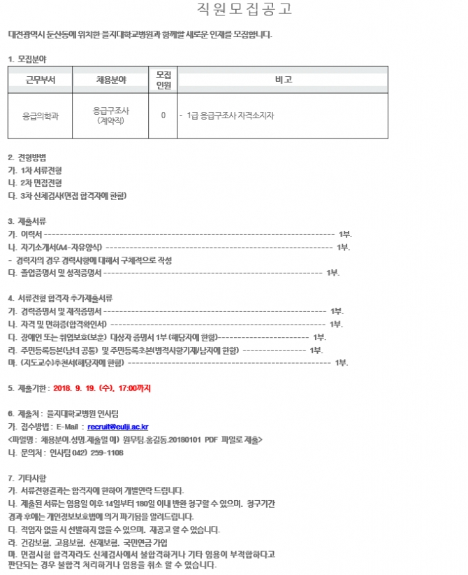 국가정보원(임기제) 응급구조사 채용안내(~ 10월5일까지)