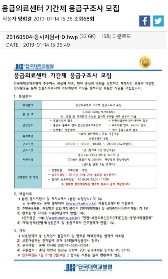 위 병원 채용에 관심이 있거나 취업을 희망하는 분들은 응급구조과 전임교수 박정제 교수님께 연락 바랍니다.